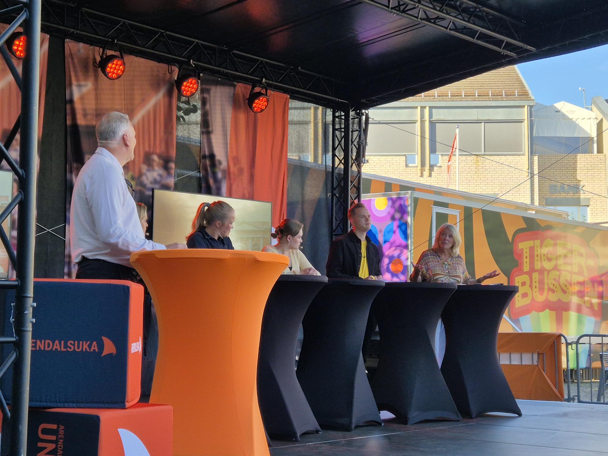 Debatten foregikk på Torvscenen i Arendal sentrum mens solen skinte fra klar himmel, og det ble delt ut pizza og brus til paneldeltakere og publikum.